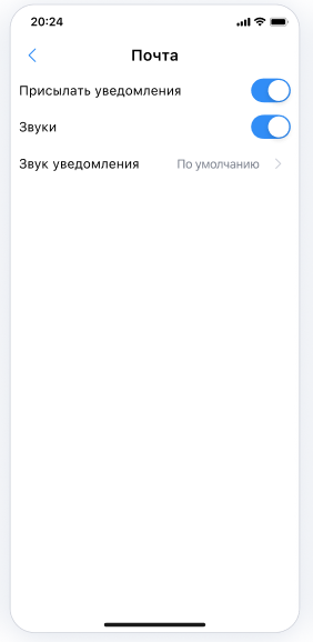 Вы можете настроить отправку уведомлений для мобильной версии клиентского приложения. Для этого перейдите в раздел с настройками и выберите, какие уведомления хотите получать — от почты и/или календаря. Вы также можете настроить уведомления от мессенджера (при наличии):