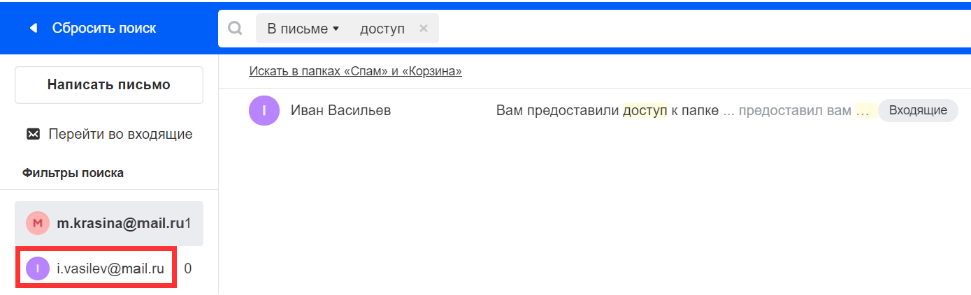 Если вам предоставлен доступ в папку в почте другого человека, то чтобы посмотреть результаты поиска по ней, выберите нужный ящик в меню слева.