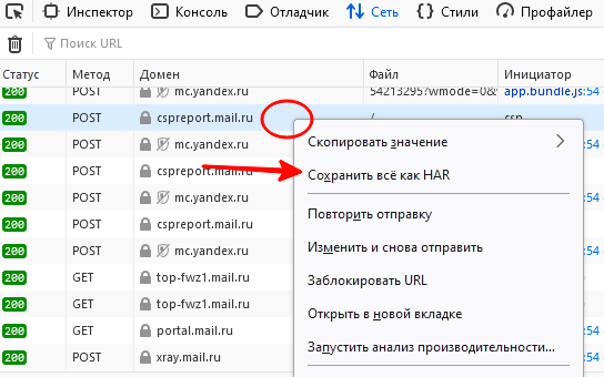 Нажмите правой кнопкой мыши в области вывода запросов. Сохраните лог, выбрав в открывшемся меню Сохранить всё как HAR.