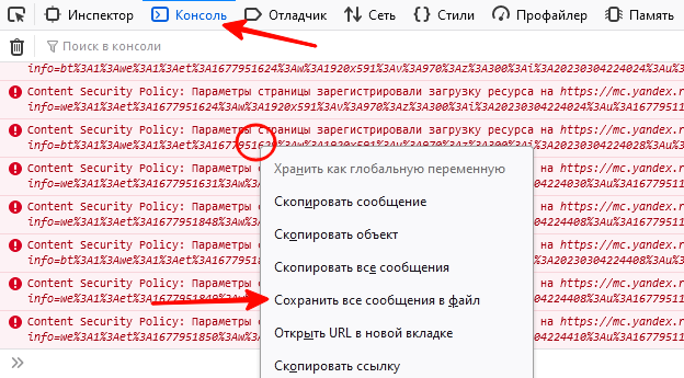 Перейдите на вкладку Консоль, нажмите правой кнопкой мыши на область вывода логов, в открывшемся меню выберите Save as... (Сохранить как…).