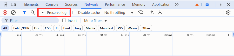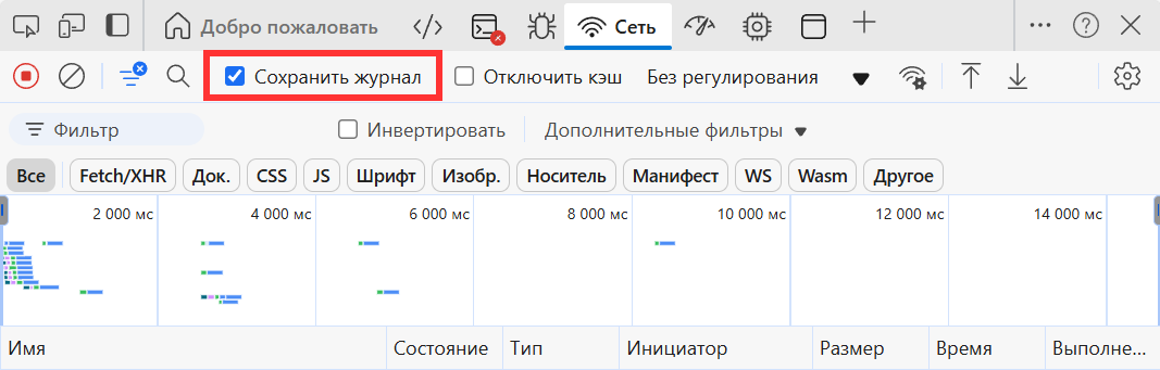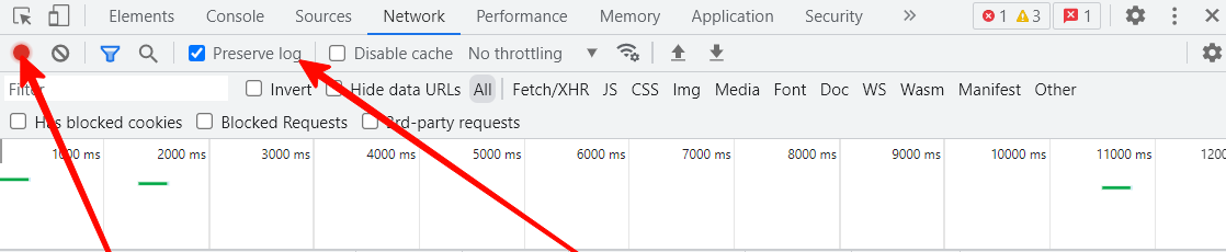 Активируйте опцию Preserve log и убедитесь, что запись лога включена (горит значок