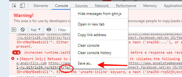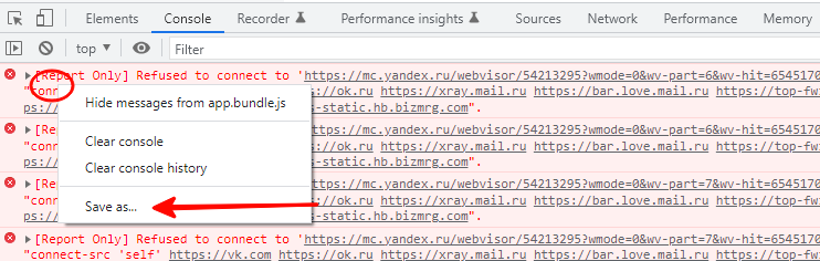 Перейдите на вкладку Console (Консоль), нажмите правой кнопкой мыши на область вывода логов: в открывшемся меню выберите Save as….