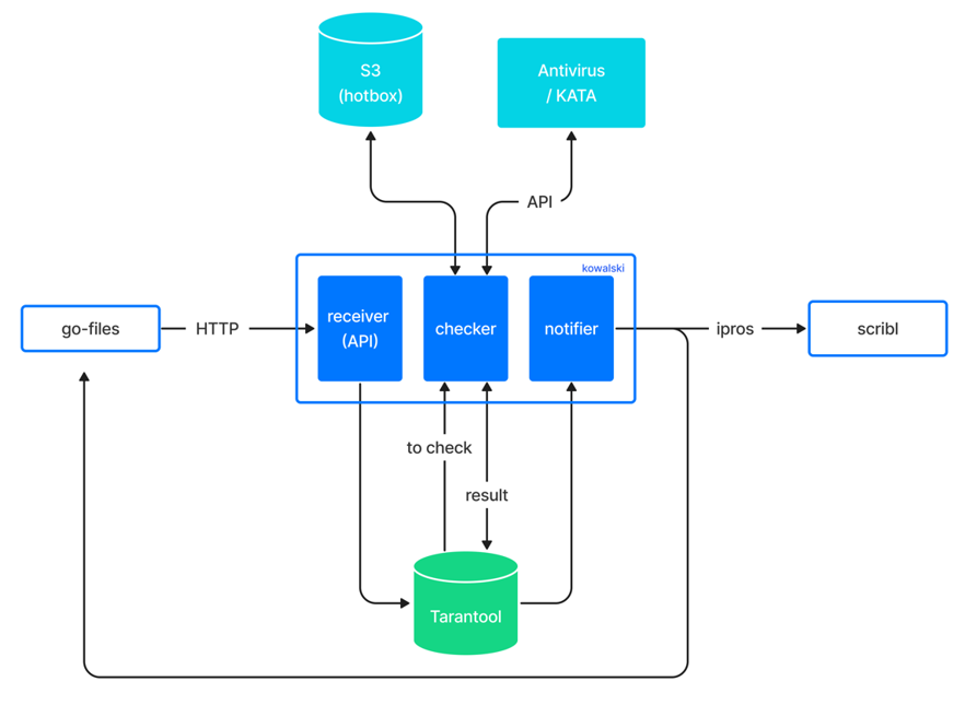 За проверку файлов антивирусом отвечает сервис Kowalski . Сервис работает на собственных локальных очередях и общается с файловым бэкендом ub.<DOMAIN> и универсальным сервисом подписок Scribl.