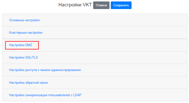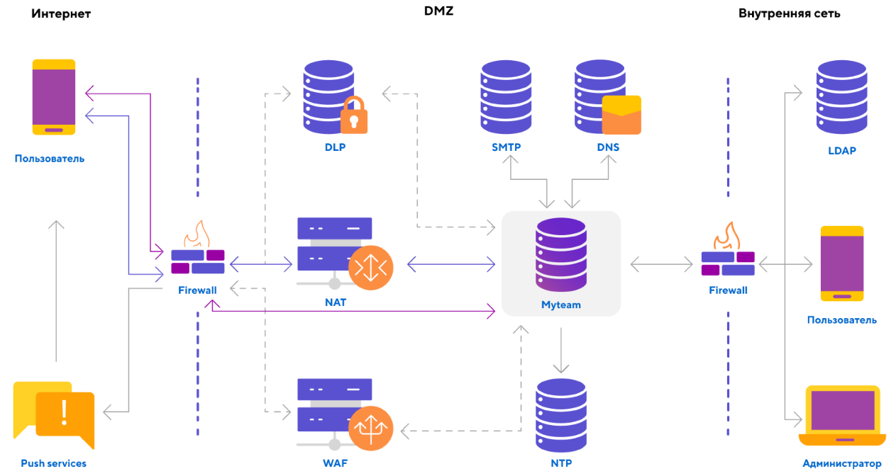 Начиная с релиза 23.8 вы можете терминировать входящие соединения от клиентских приложений в отдельной сети. Часть компонентов кластера Мессенджер и ВКС выносится в отдельную сеть для реализации DMZ.