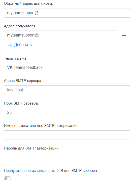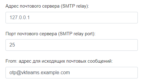 Авторизация пользователей в Мессенджер и ВКС выполняется с помощью одноразовых кодов (OTP via email). Для доставки писем с одноразовыми кодами необходим SMTP-сервер, на котором разрешена отправка почтовых сообщений для данной виртуальной машины — без авторизации и блокировки антиспам-системой.