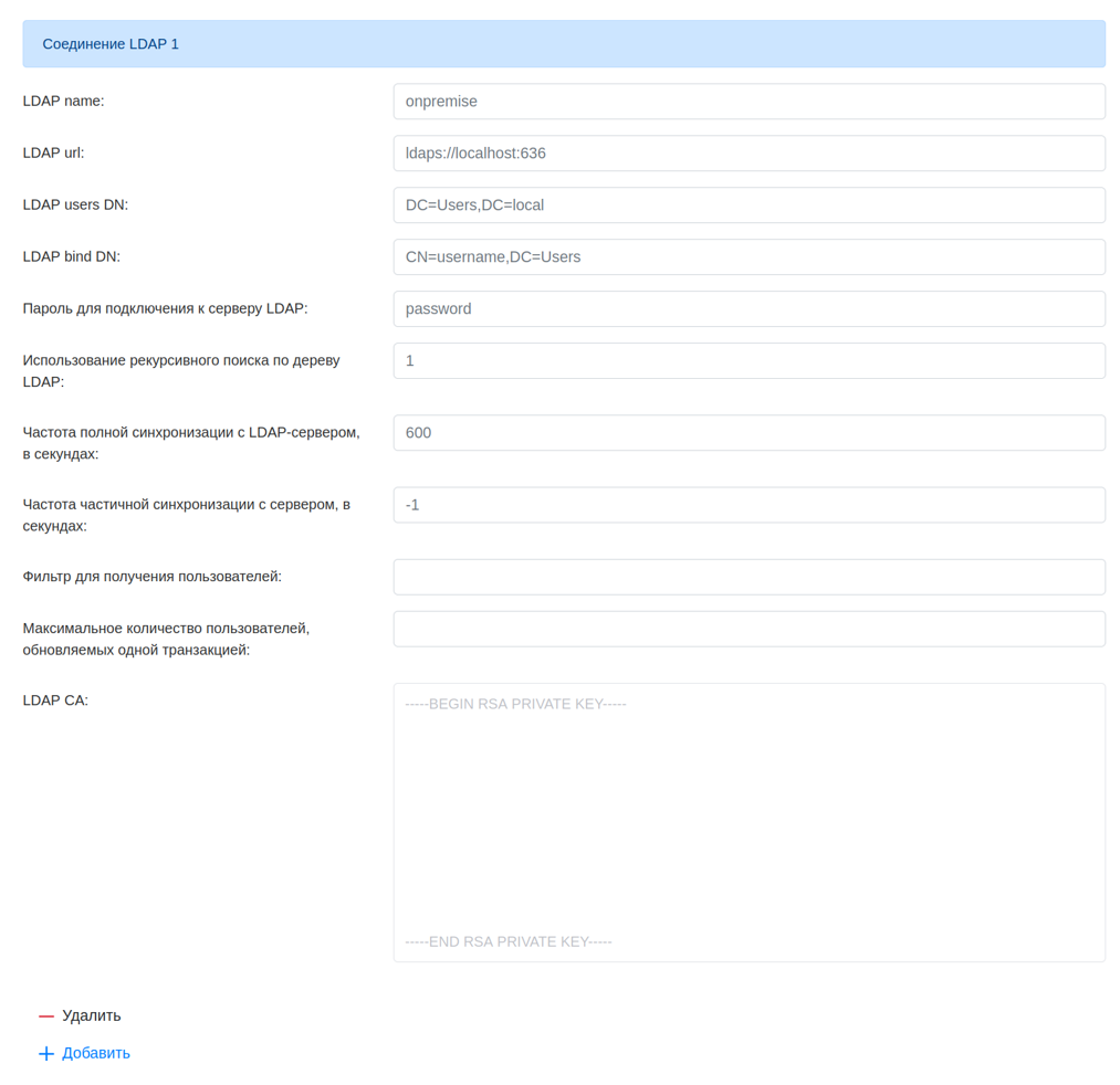 - Настройки для соединения с LDAP-сервером: bind_dn, user_dn, url, password, CA-сертификат.