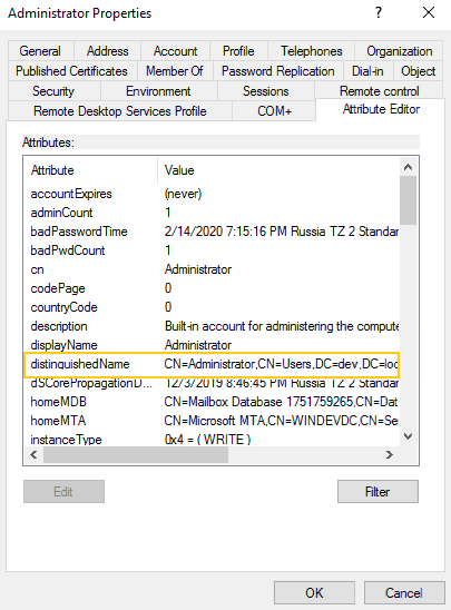 На вкладке будет отображено значение distinguishedName. Повторите операцию, чтобы получить distinguishedName для каталога, в котором будет выполняться поиск пользователей.