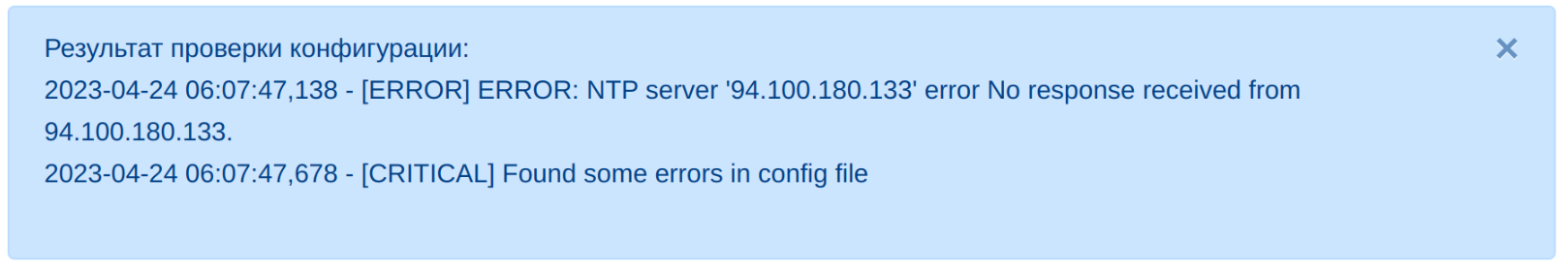 После сохранения настроек будет произведена их проверка. Если открыты не все нужные порты либо нет интеграции с базовым набором сервисов (DNS, SMTP, NTP), отобразится уведомление о необходимости правок: