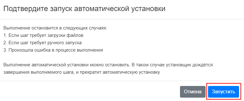 Подтвердите запуск автоматической установки, нажав на кнопку Запустить: