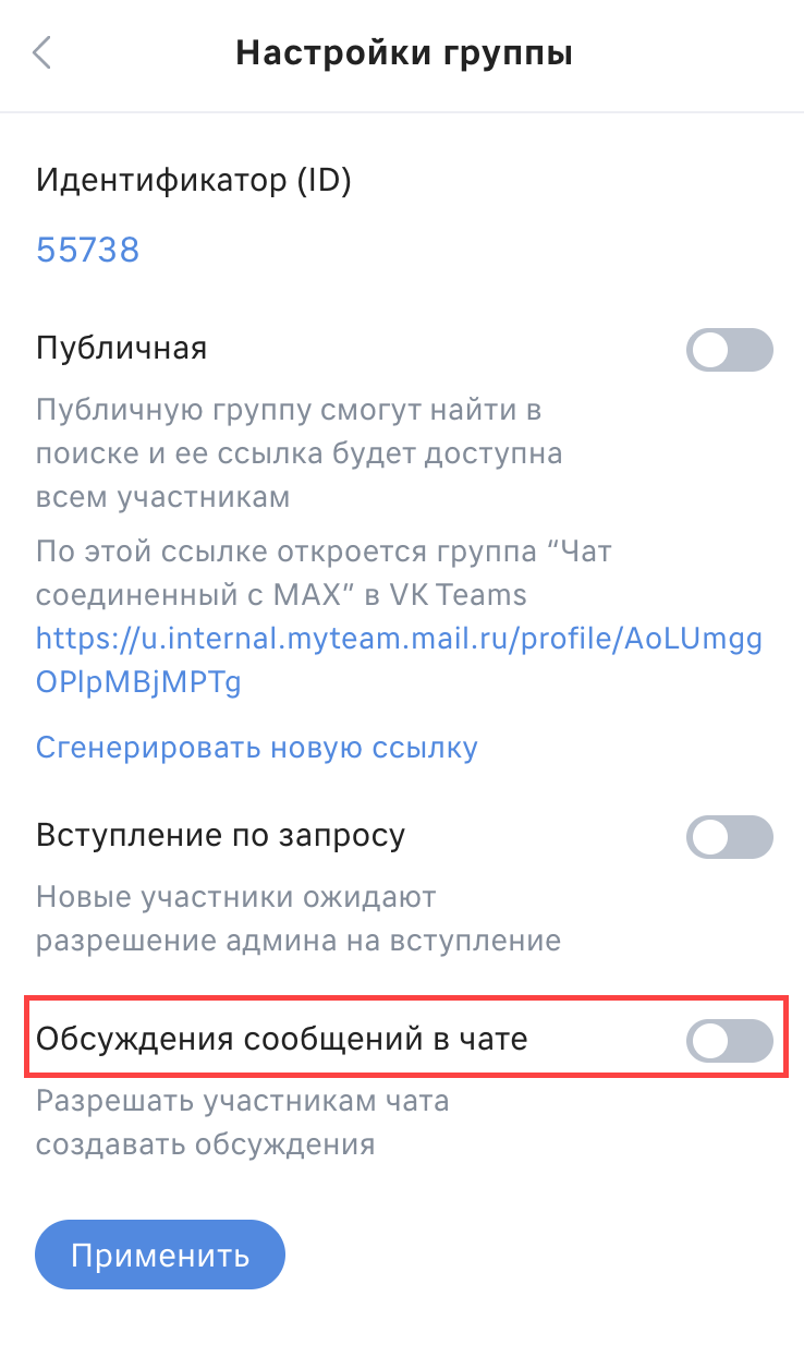 В Мессенджере создайте новый групповой чат (или используйте существующий) и отключите в настройках возможность создания новых обсуждений: