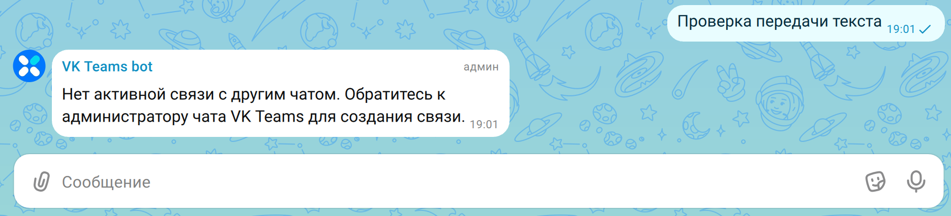 При отсутствии активной связи с чатом Мессенджера на каждое сообщение в чате от бота будет приходить оповещение об отсутствии связи с другим чатом.