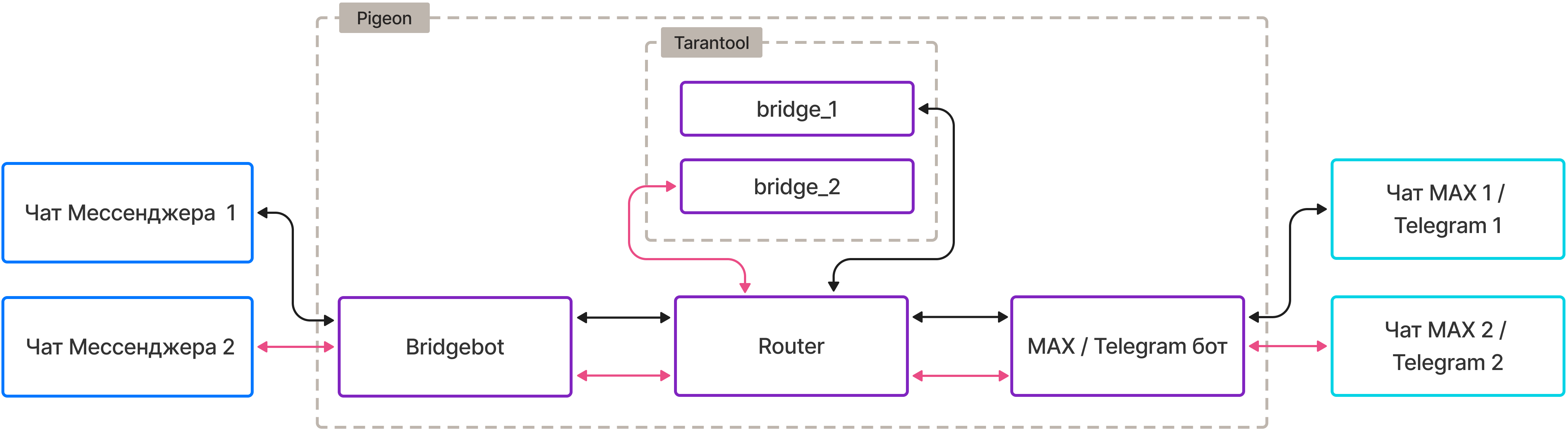 Взаимодействие между чатами выполняется с помощью сервиса Pigeon, который осуществляет перенаправление сообщений из бота Мессенджера в боты MAX или Telegram и в обратном направлении.