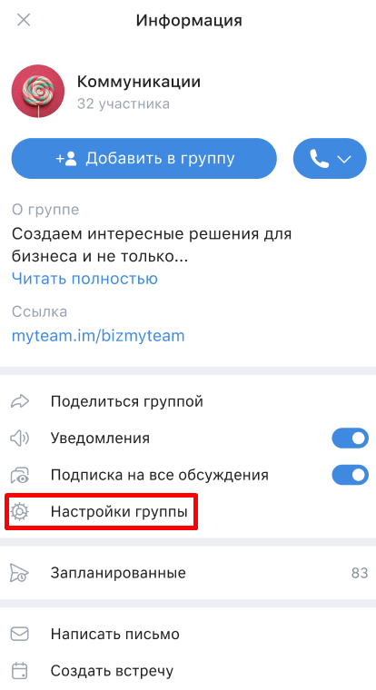 Нажмите на Настройки группы.