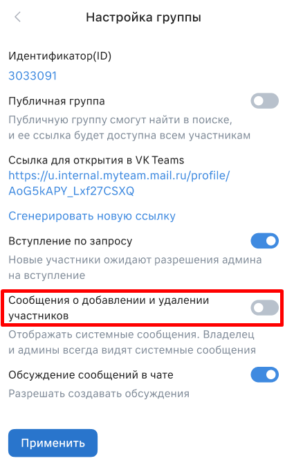 Активируйте переключатель Сообщения о добавлении и удалении участников.