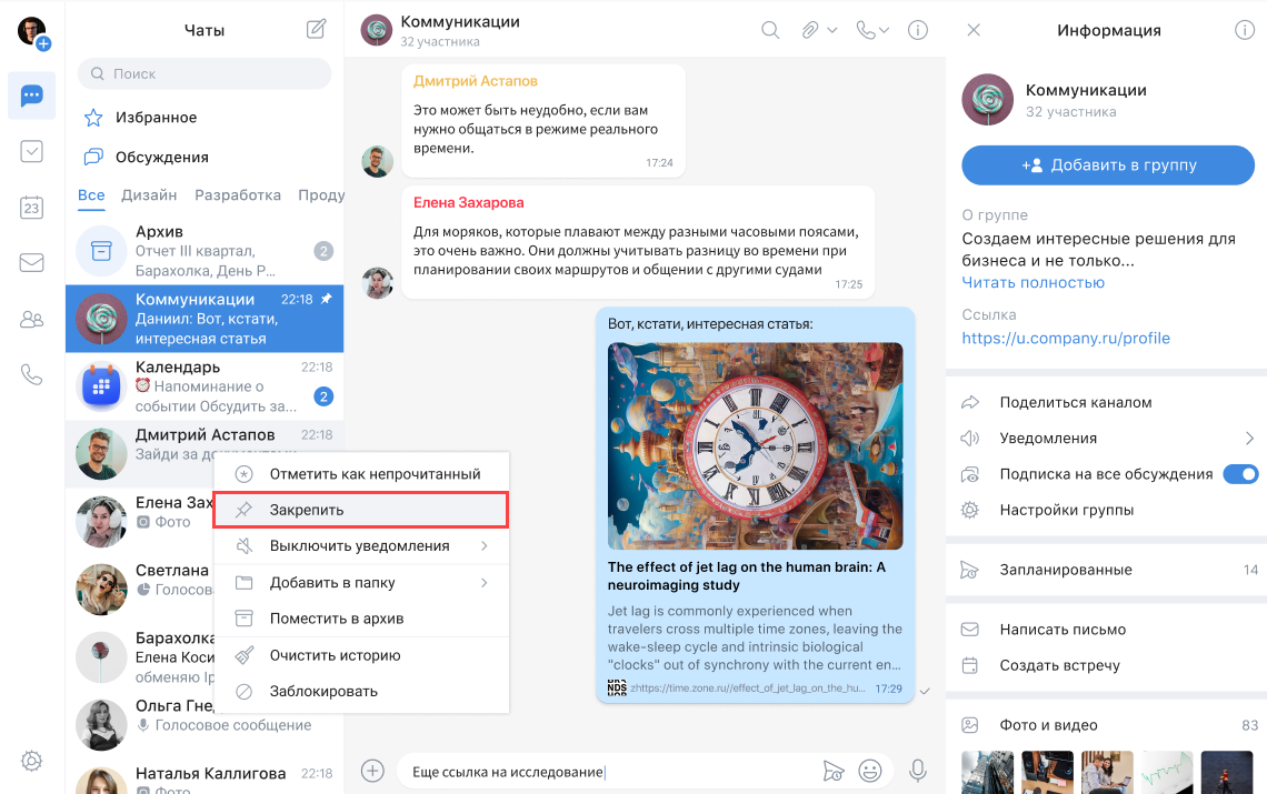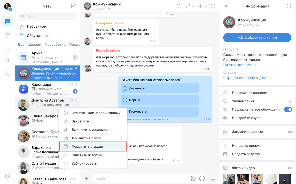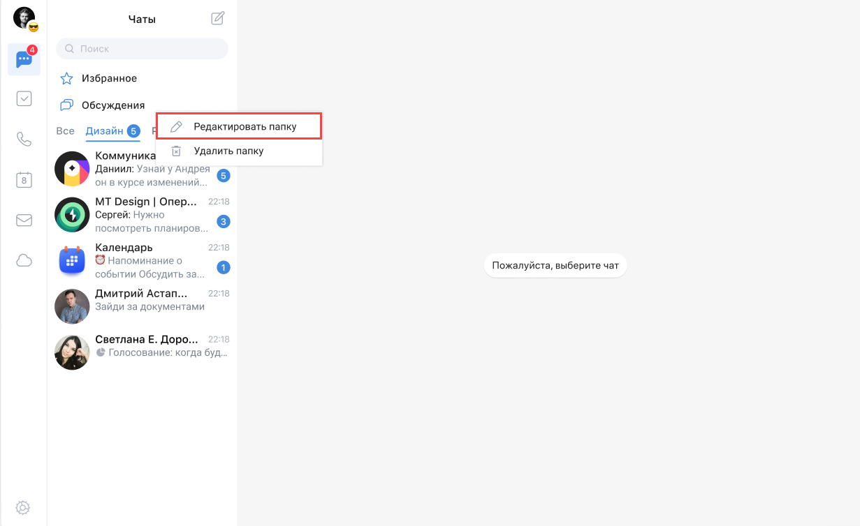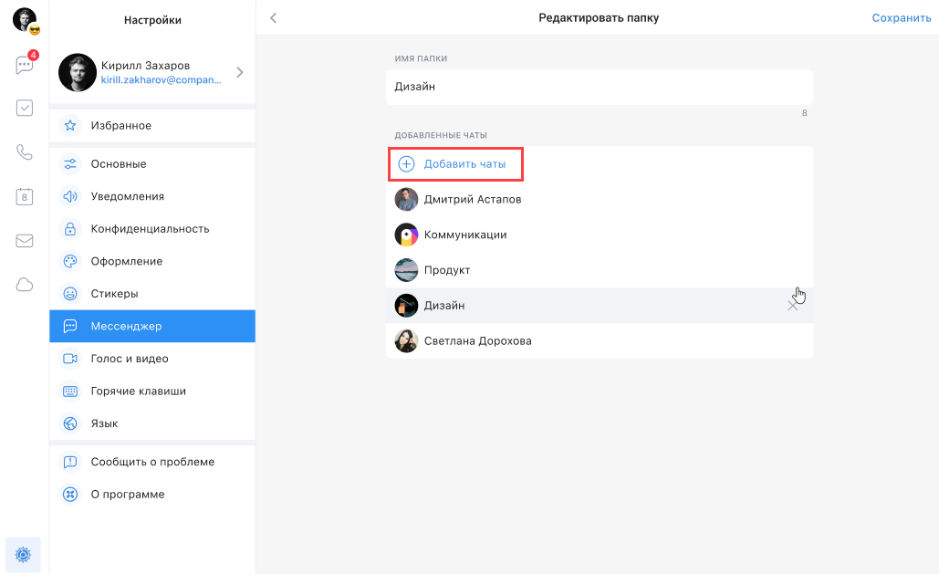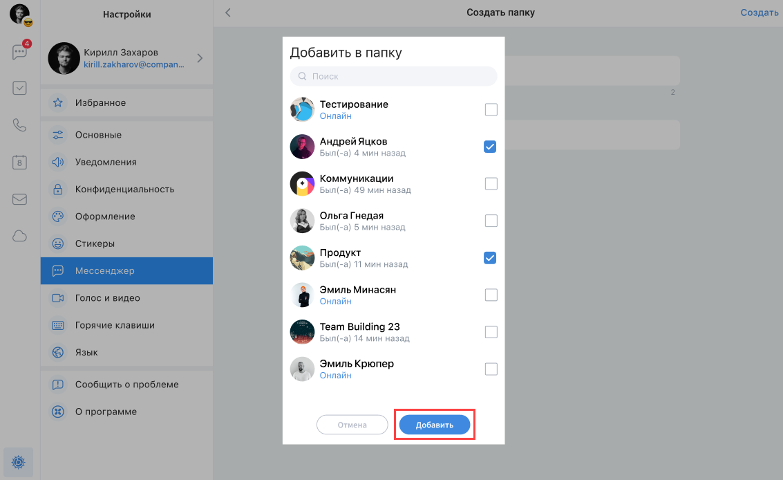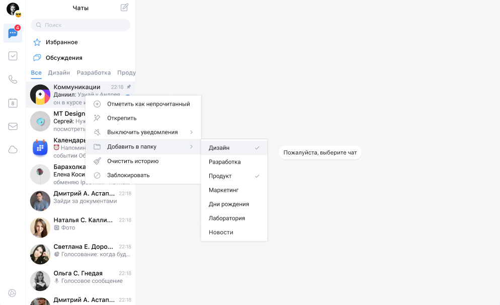 Чтобы добавить чат в папку, нажмите на чат правой кнопкой мыши, выберите пункт Добавить в папку и выберите необходимые папки. Возможен выбор нескольких папок из списка: