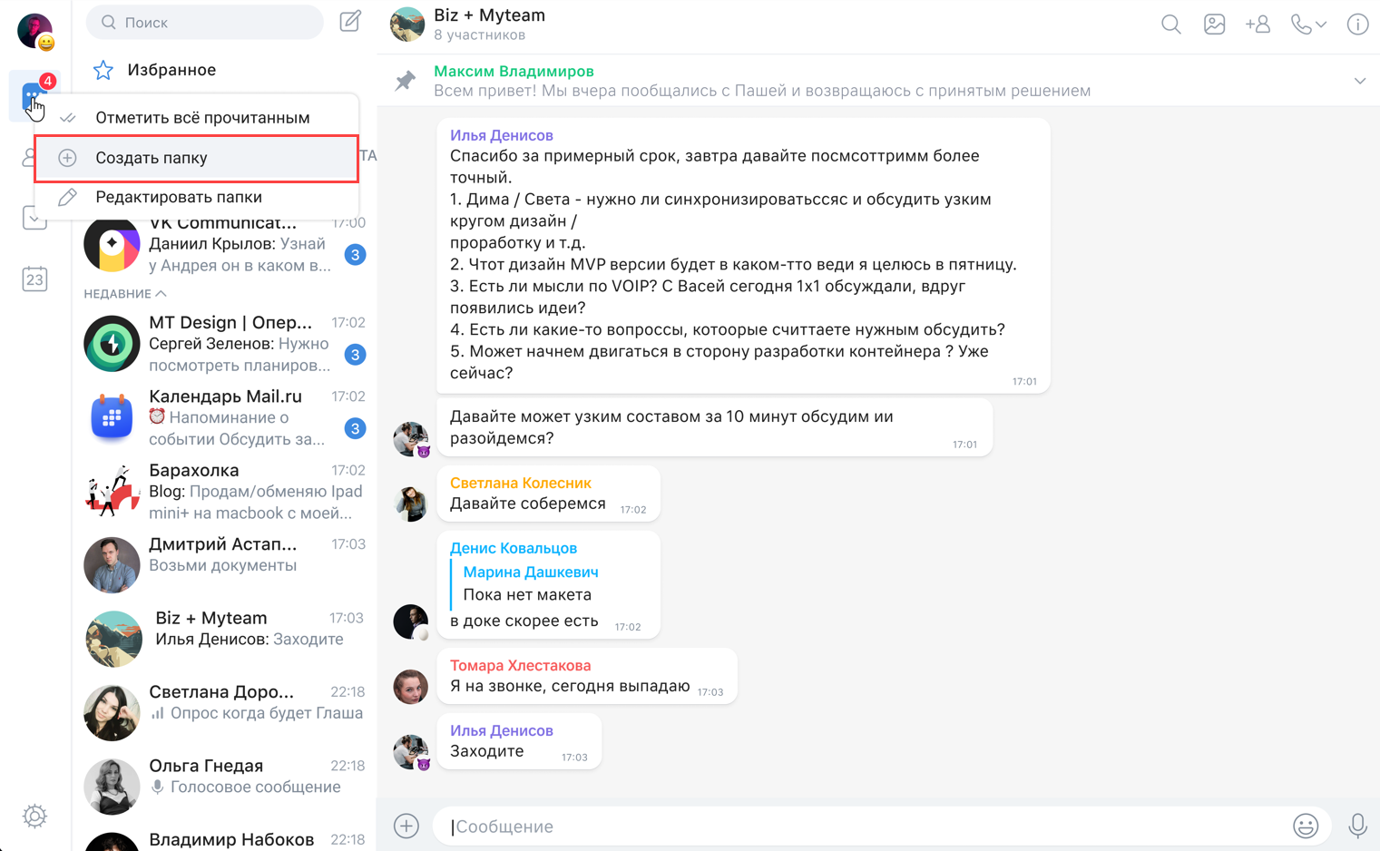 Нажмите на иконку чатов правой кнопкой мыши и выберите в отобразившемся меню пункт Создать папку: