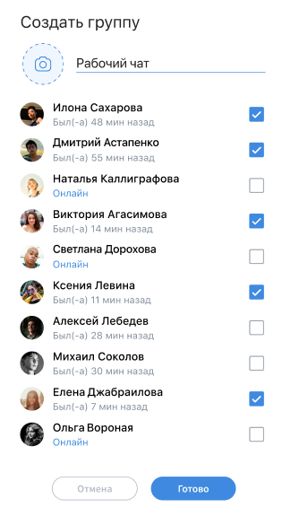 в левом верхнем углу и выберите Создать группу. Далее добавьте участников из списка ваших контактов: -
