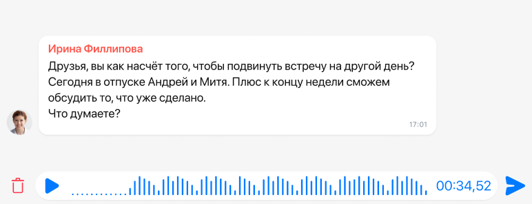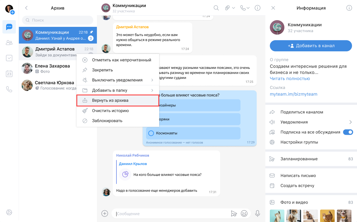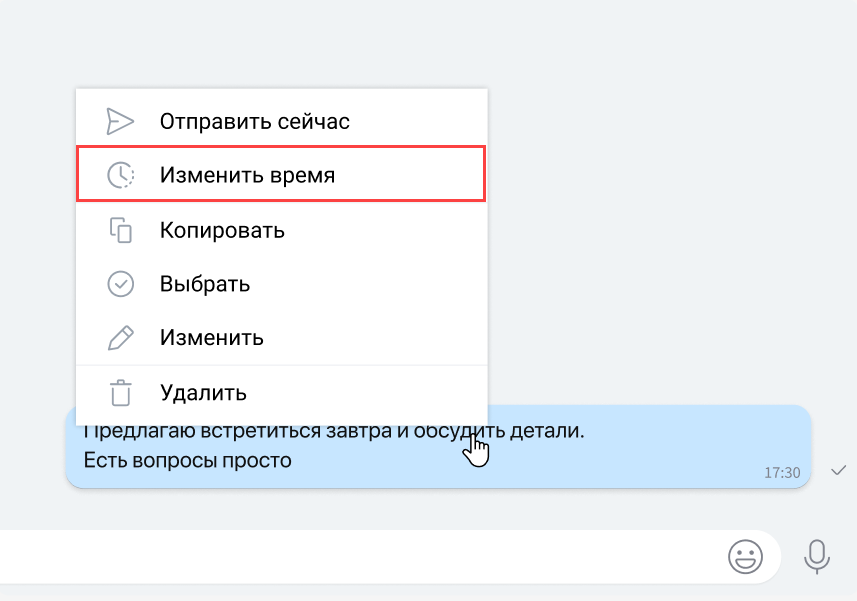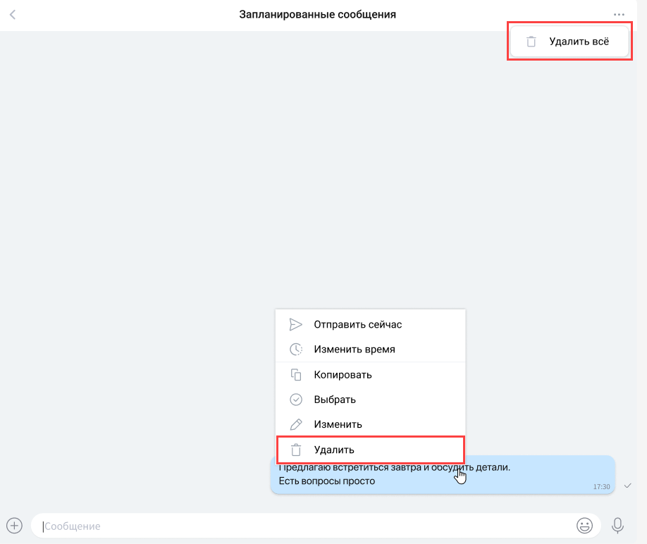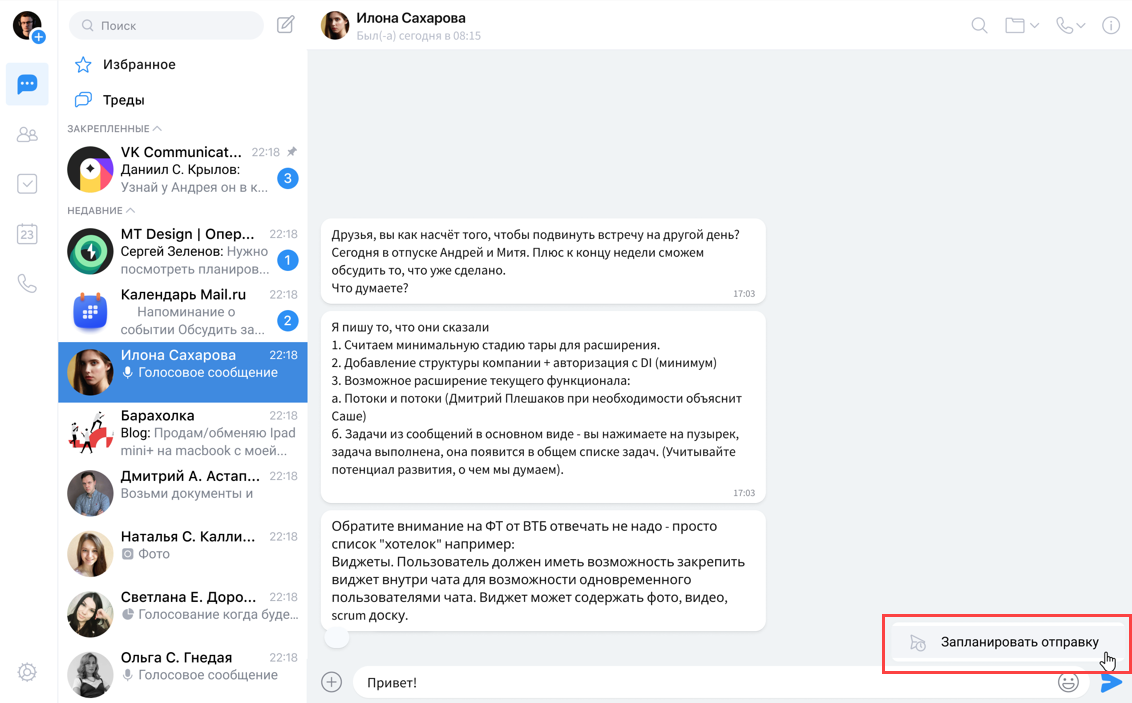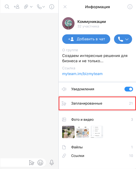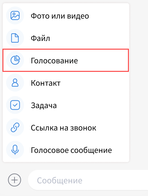 Чтобы создать голосование с отложенной отправкой в чат, перейдите в чат и далее в запланированные сообщения. Создайте голосование и нажмите на кнопку Отправить. Выберите дату и время отправки файла и нажмите на кнопку Готово.