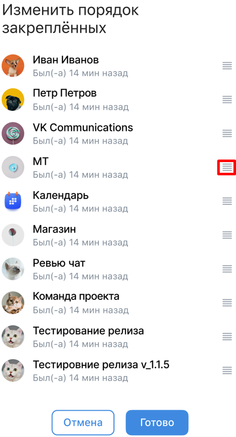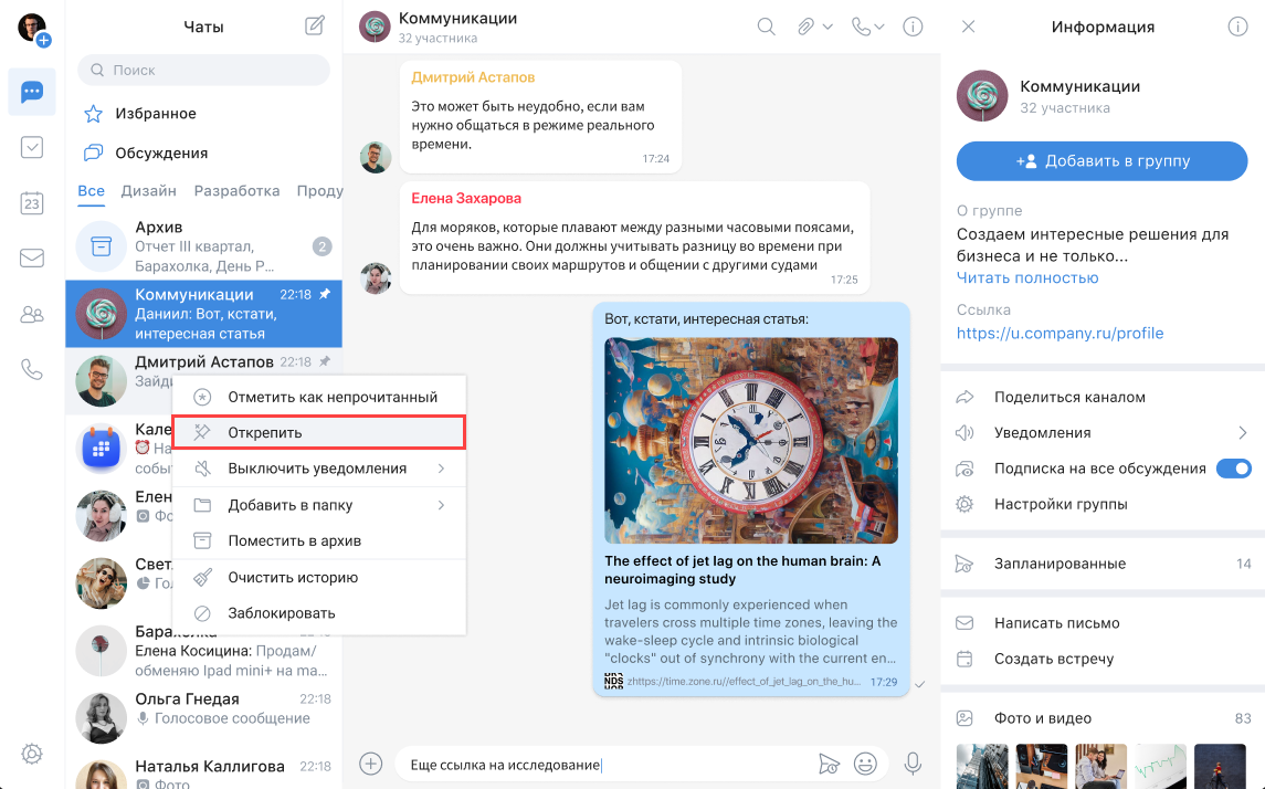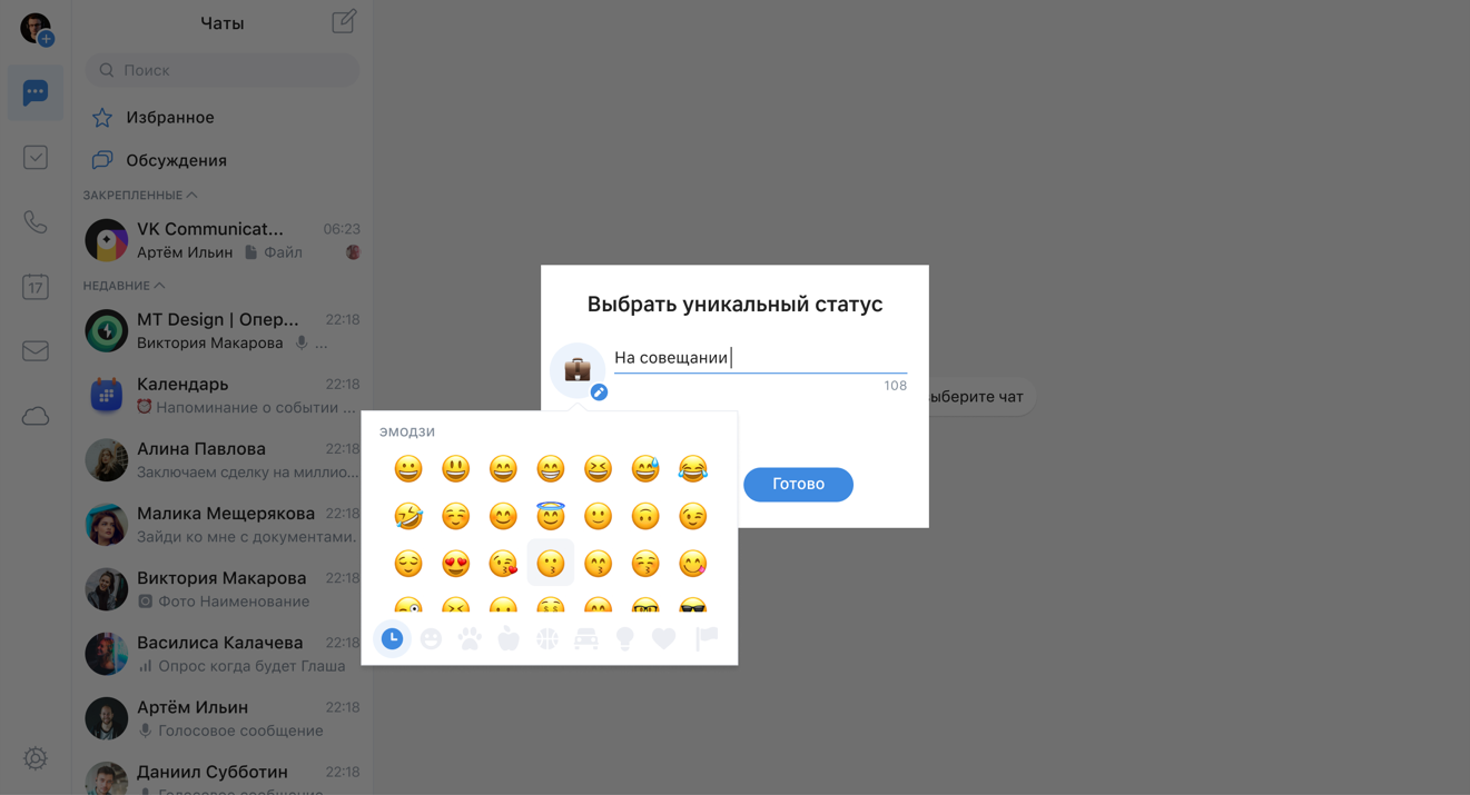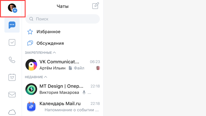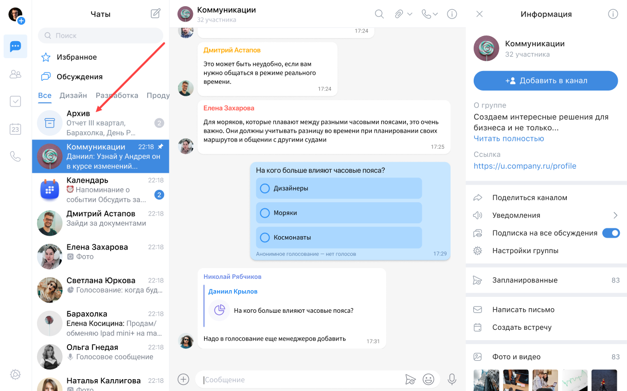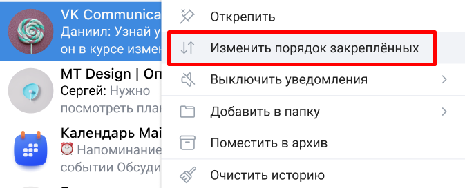 - контакты (в том числе тех, с которыми еще нет чата) — при создании чата с контактом он сразу будет отображаться в нужной папке;