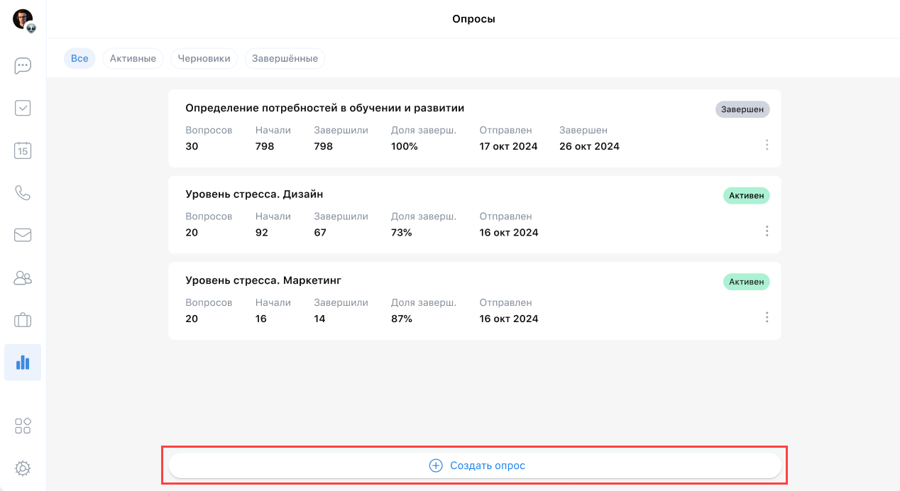 - Остановить опрос — опрос перейдет в статус «Завершен».