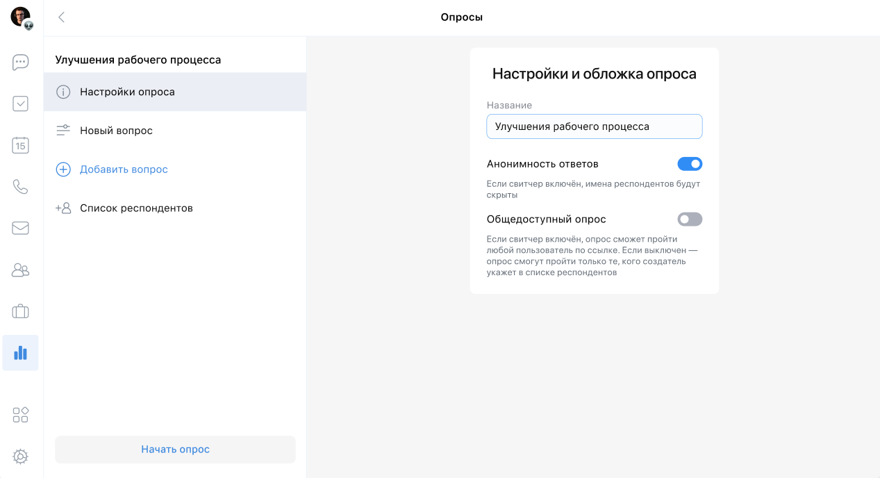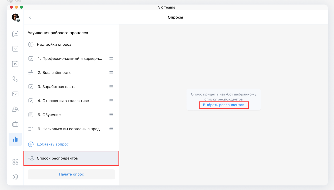 - Поделиться опросом — после выбора респондентов ссылка на опрос будет отправлена в личную переписку.