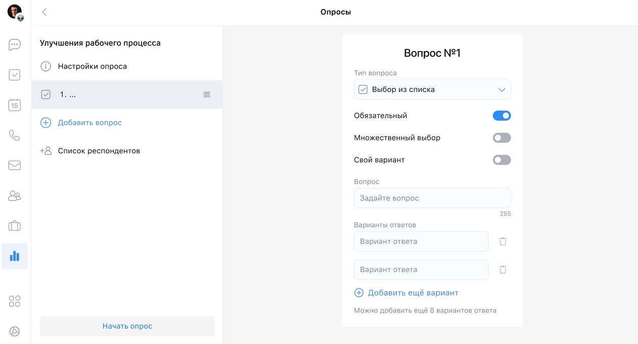 Свой вариант (доступен для типа вопроса «Выбор из списка») — респонденты смогут предложить свой вариант ответа на этот вопрос.