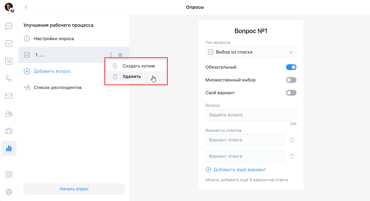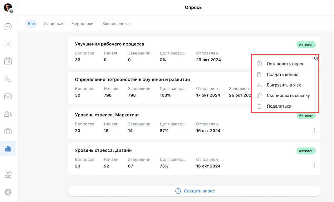 - Создать копию опроса — черновик опроса появится в списке всех опросов без отправки респондентам.