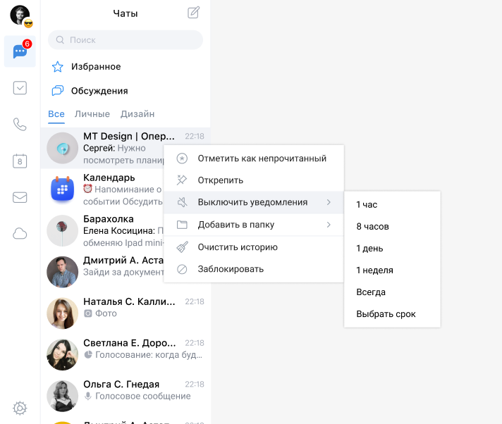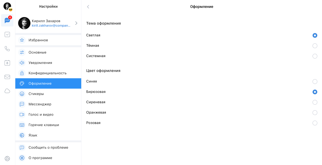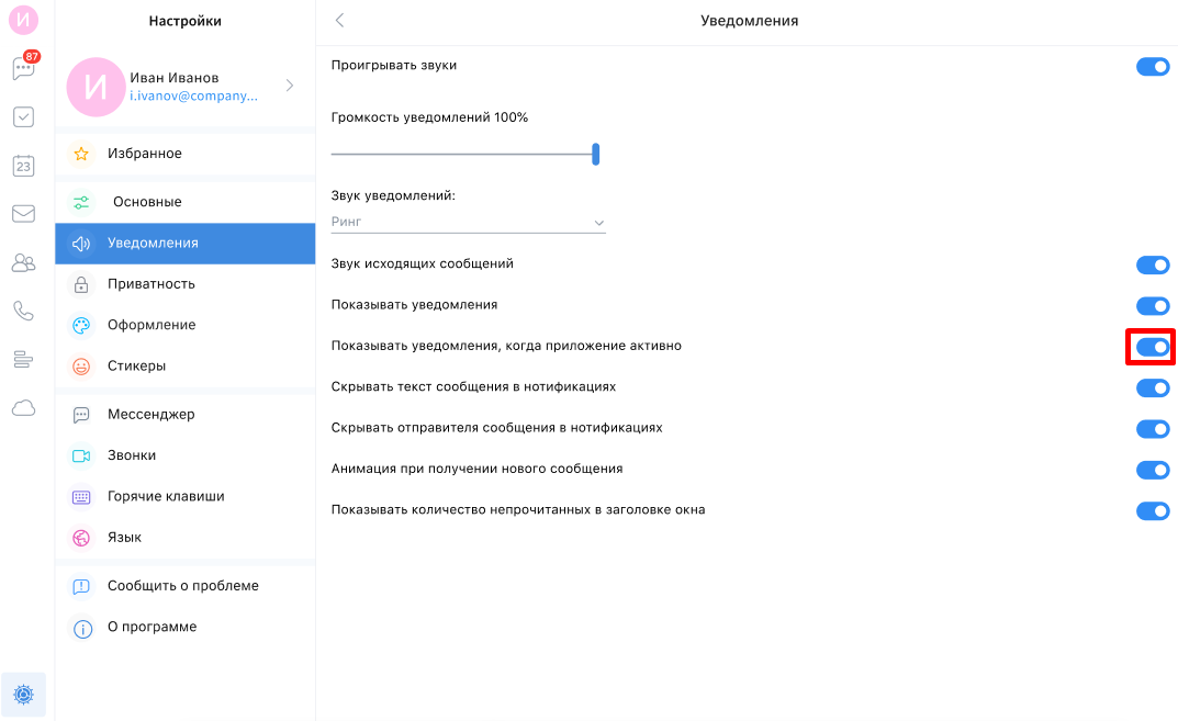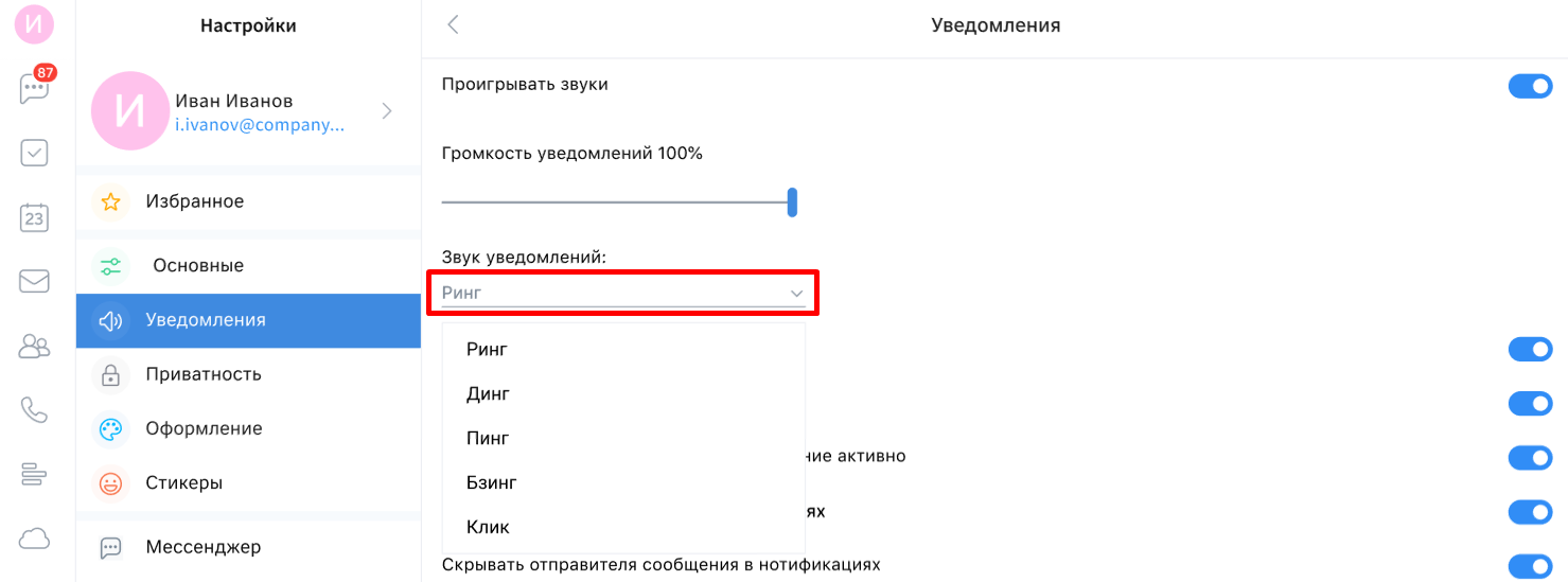 Вы можете настроить отправку уведомлений для мобильной версии клиентского приложения. Для этого перейдите в раздел с настройками и выберите необходимые опции для звуков и отображения уведомлений. Вы также можете настроить уведомления от почты и календаря (при их наличии):