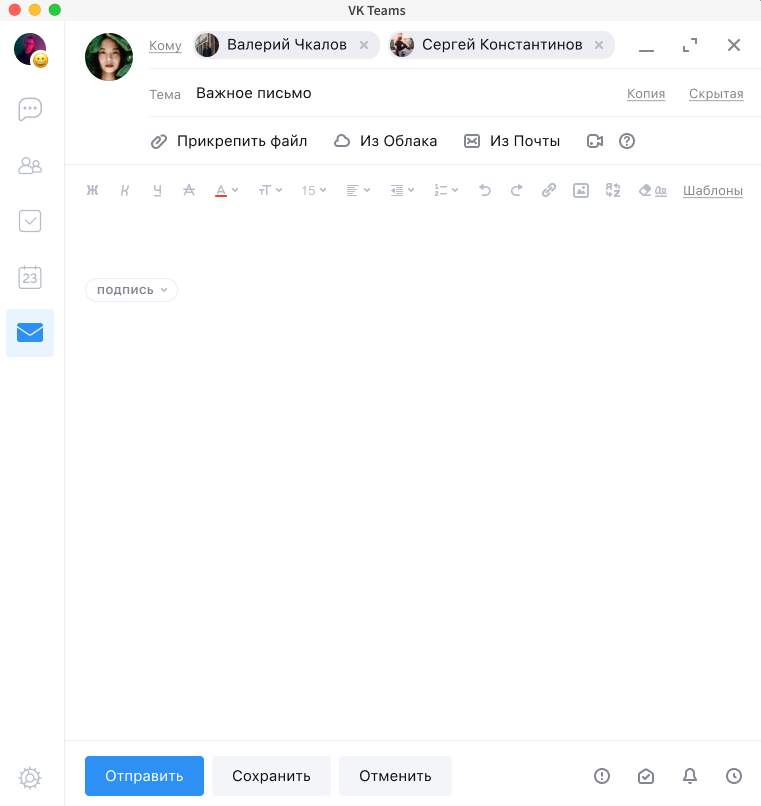 Суперапп можно выбрать почтовым клиентом по умолчанию. В таком случае при нажатии на электронную почту или по ссылке вида mailto в чате Мессенджера откроется интегрированная почта (Почта VK WorkSpace либо дефолтный почтовый клиент).
