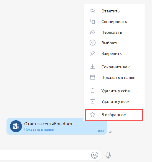 Чтобы сохранить необходимые файлы, ссылки и сообщения в избранное, нажмите на необходимый элемент диалога правой кнопкой мыши и выберите В избранное: