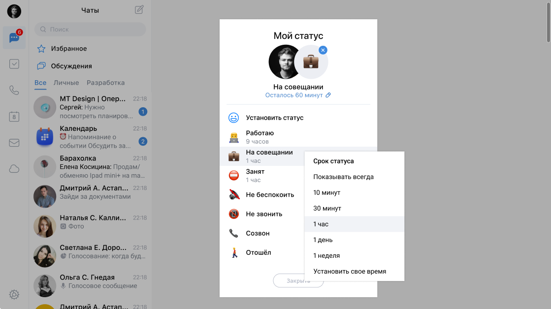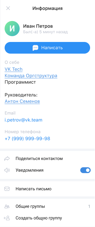 Сотрудник будет автоматически добавлен в ваш личный список контактов на вкладке Чаты, как только вы вступите с ним в переписку.