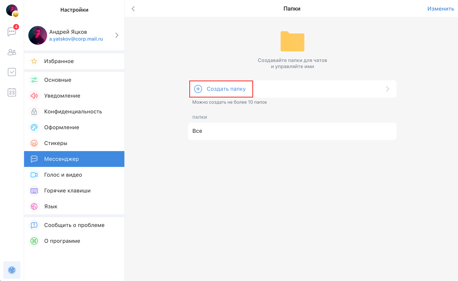 либо перейдите в меню Настройки → Мессенджер → Папки и нажмите на кнопку Создать папку: