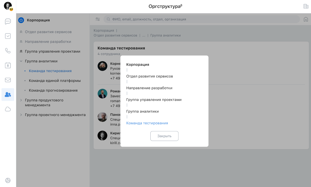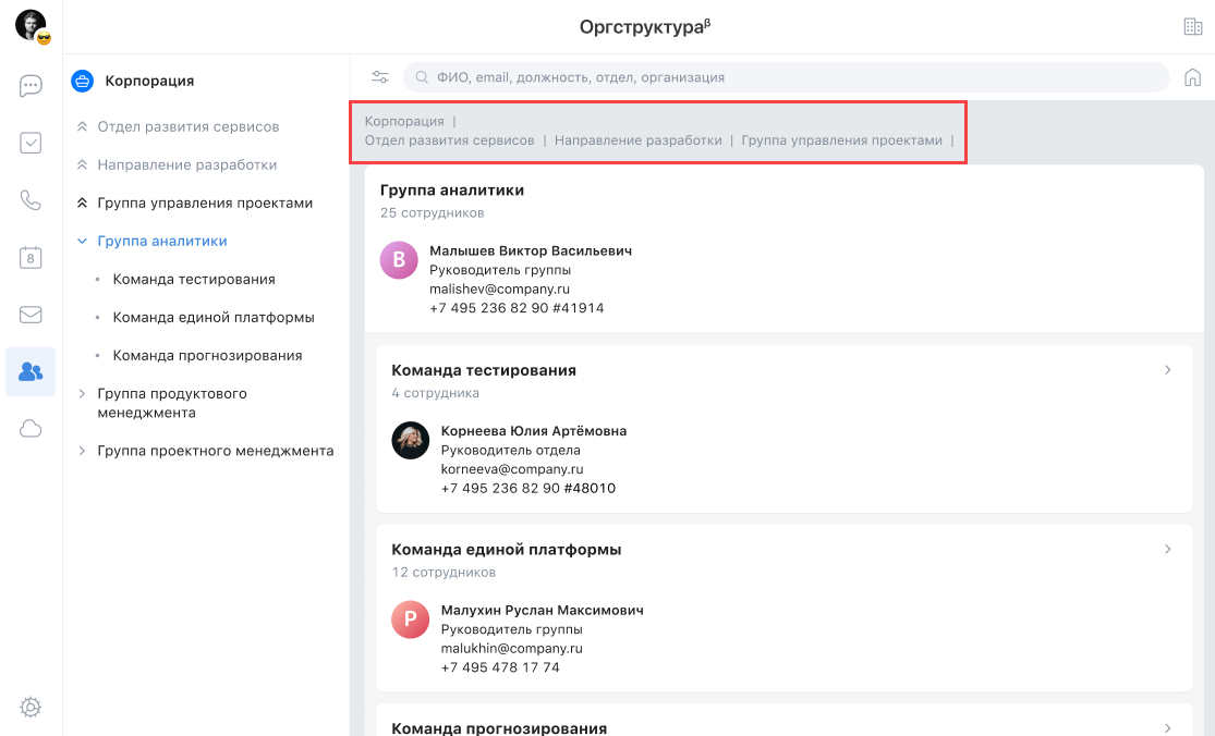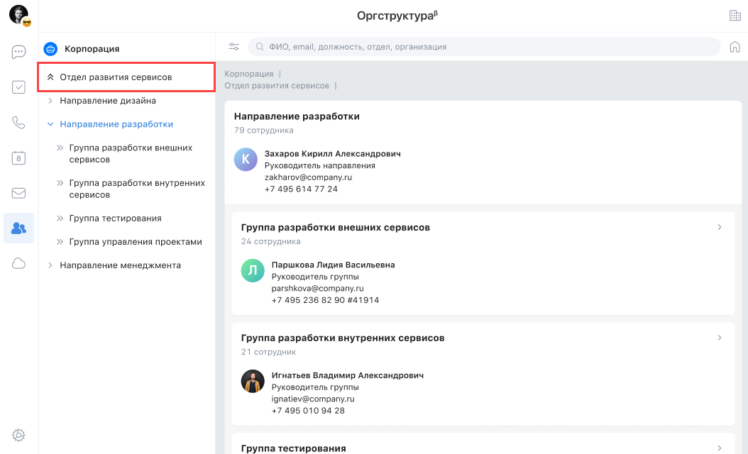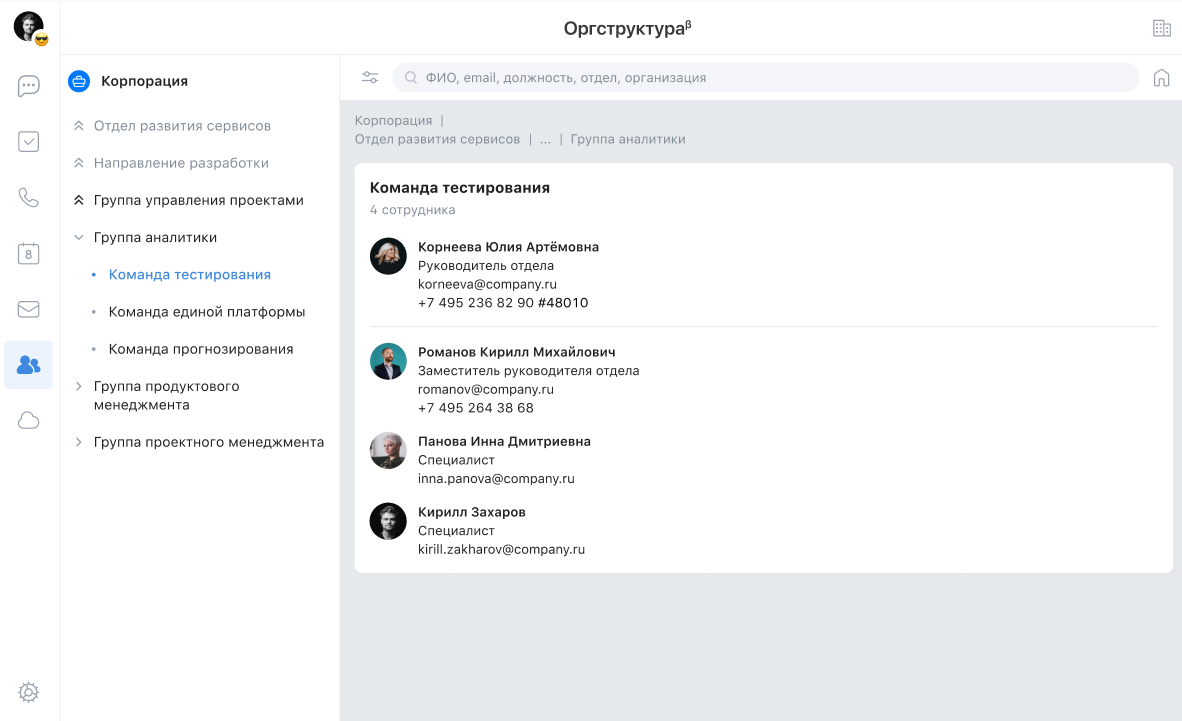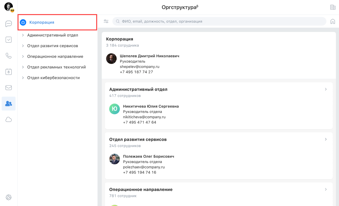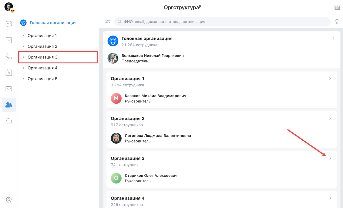Организационная структура — это сервис, который позволяет просматривать иерархию между организациями и подразделениями, искать сотрудников и просматривать их положение в иерархии.