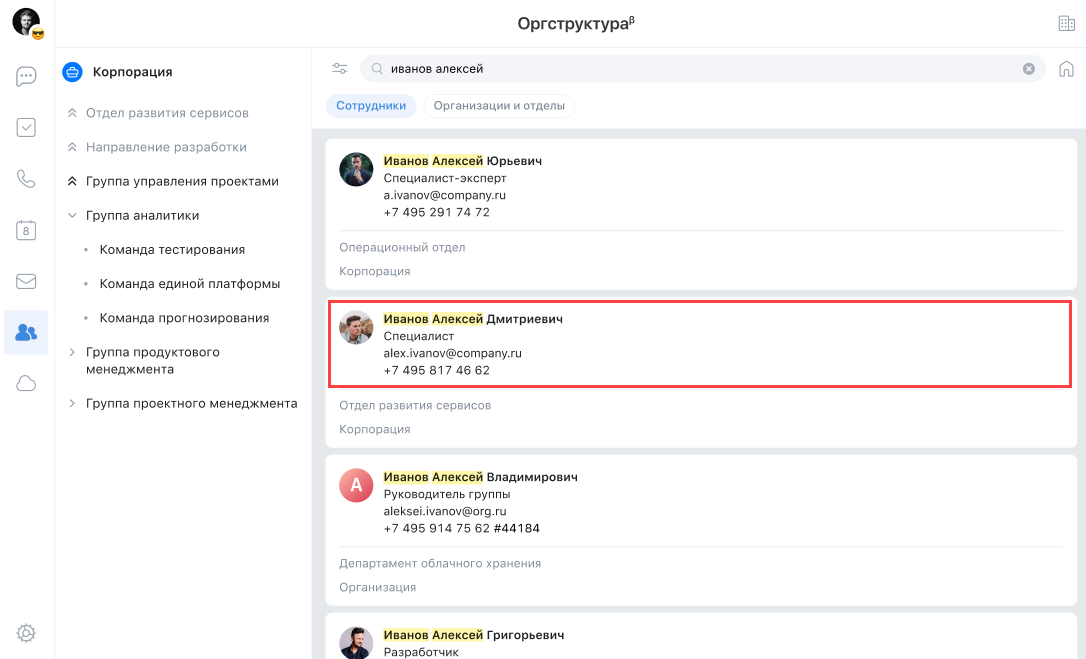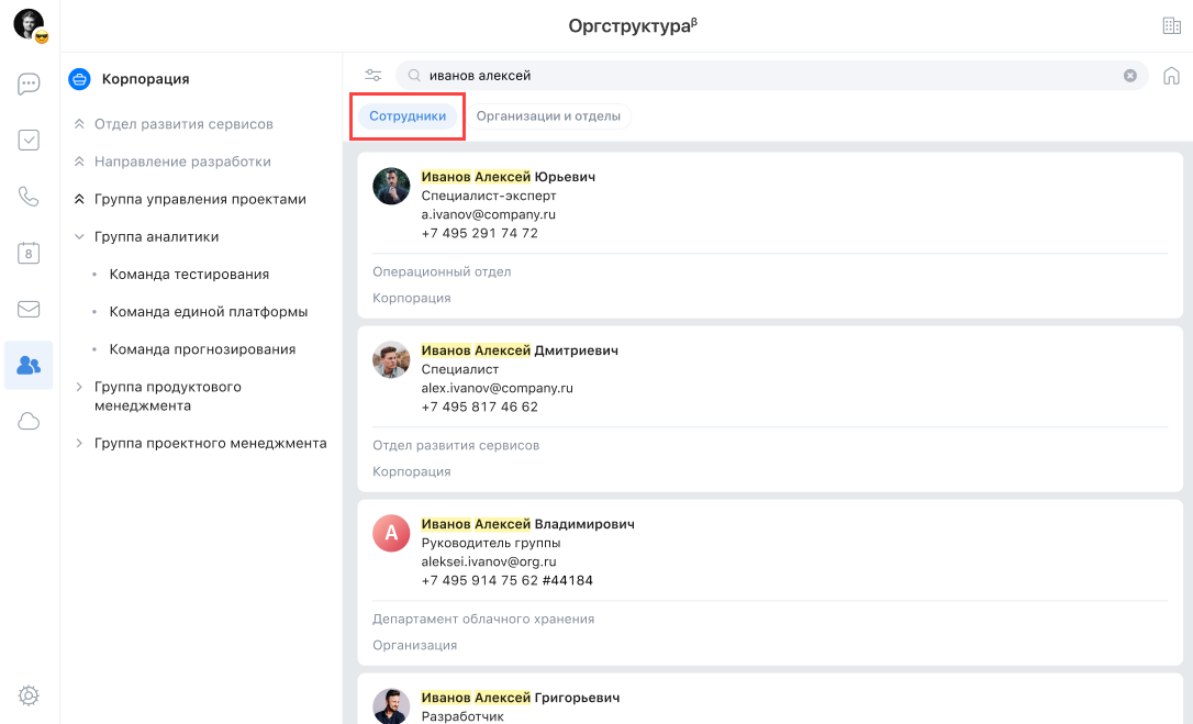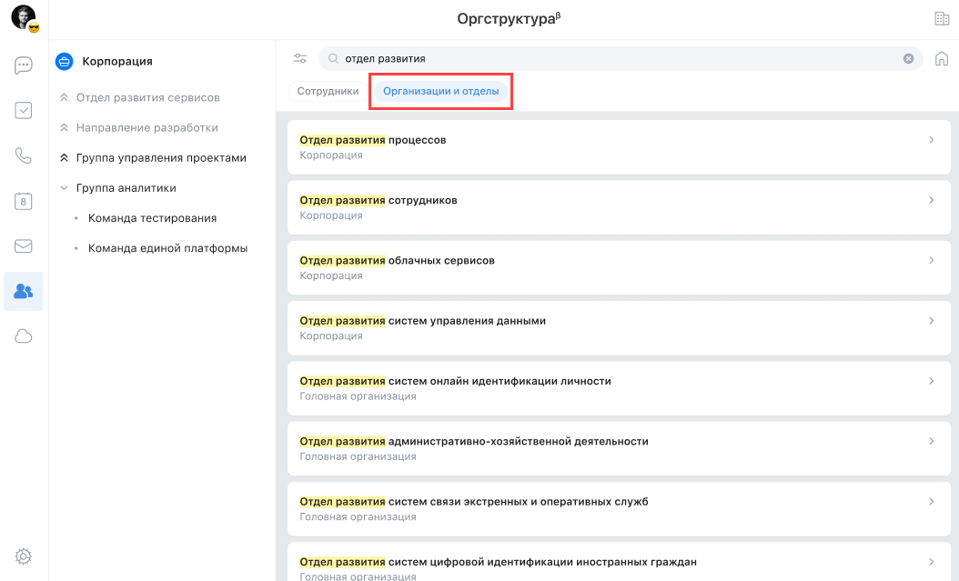 Начните вводить поисковой запрос — под поисковой строкой появляется переключатель. Искать можно по сотрудникам или организациям/отделам. Переключатель по умолчанию установлен в состояние Сотрудники.