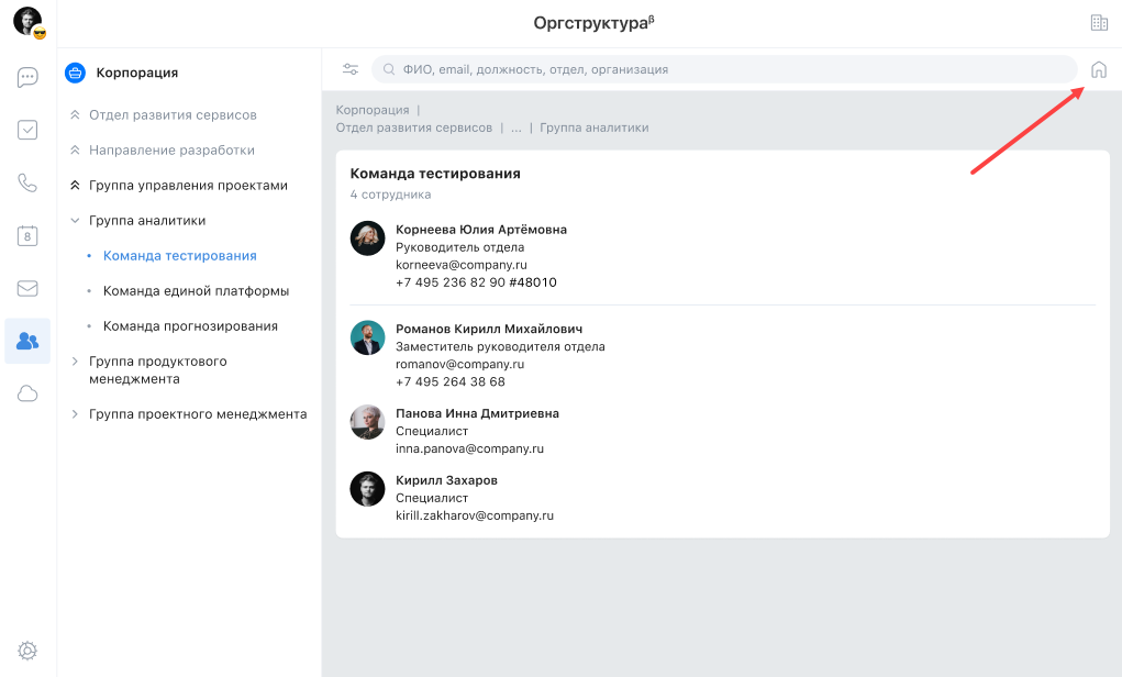 При входе в сервис всегда открывается подразделение, в котором вы работаете. Здесь вы можете посмотреть информацию о коллегах из вашего подразделения и вашем руководителе.