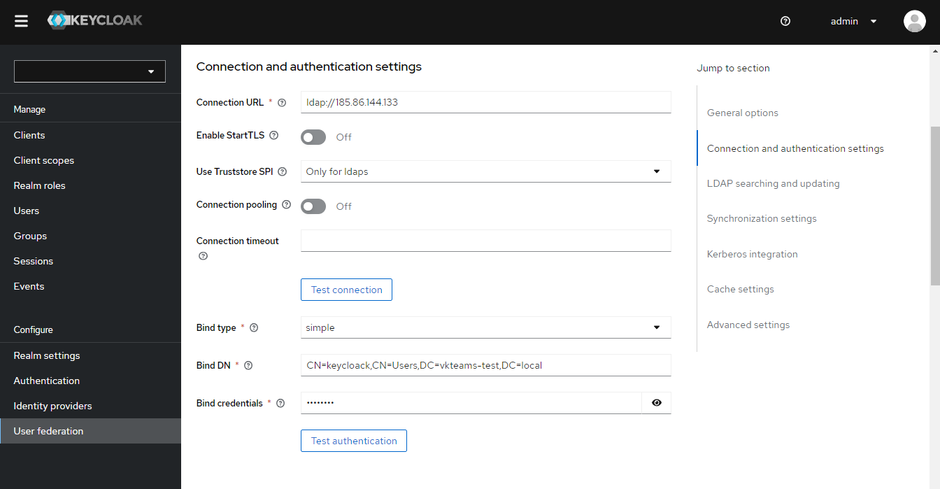 Для проверки настроенного соединения нажать на кнопку Test connection. При успешном соединении получаем сообщение «Successfully connected to LDAP».