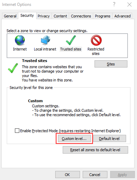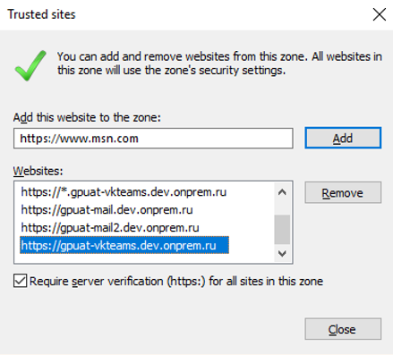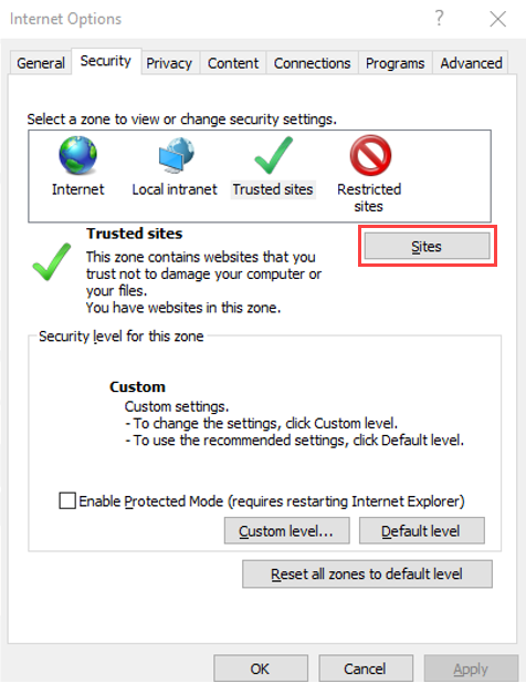 Перейти на вкладку Security -> нажать Trusted sites -> нажать на кнопку Sites: