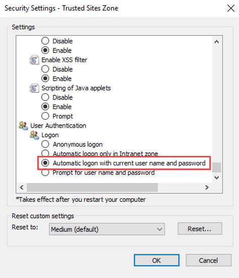 Нажать на кнопку Custom level… и установить переключатель Automatic login with current user name and password: