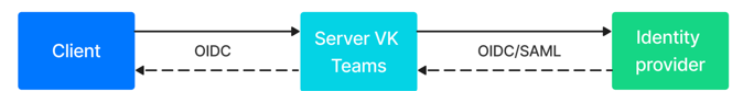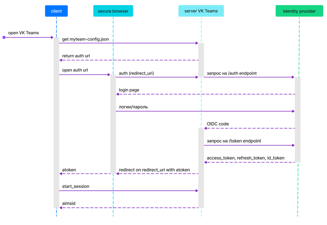 - Сервер Мессенджер и ВКС составляет запрос в Identity Provider на /auth endpoint и перенаправляет на него клиента.
