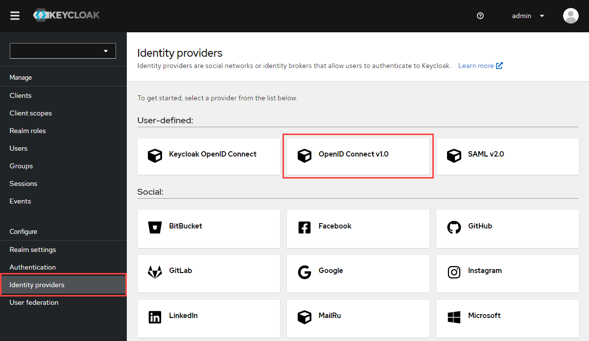 Перейти Identity Providers → выбрать необходимый протокол: -