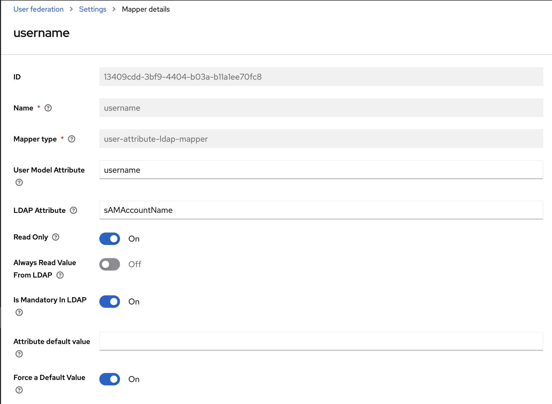 cn, то необходимо обновить информацию в разделе User Federation -> LDAP -> Mappers -> username, поле LDAP Attribute: -