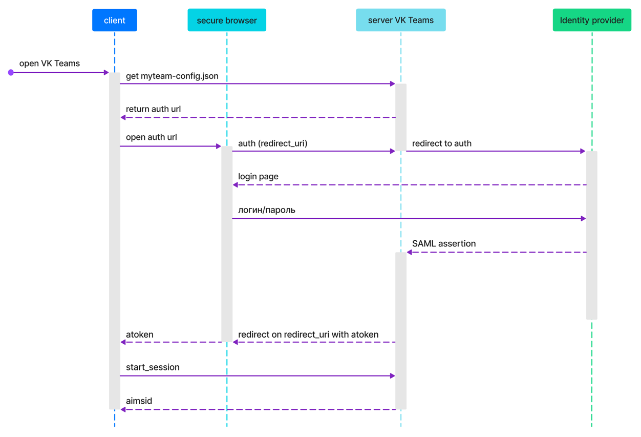 В процессе аутентификации пользователя сервер Мессенджер и ВКС перенаправляет пользователя на провайдера аутентификации. Клиент переходит по указанным redirect'ам, пользователь вводит аутентификационные данные. Далее клиент начинает новую сессию мессенджера и пользуется идентификатором сессии (aimsid) во всех запросах. При отзыве access_token'а aimsid инвалидируется.