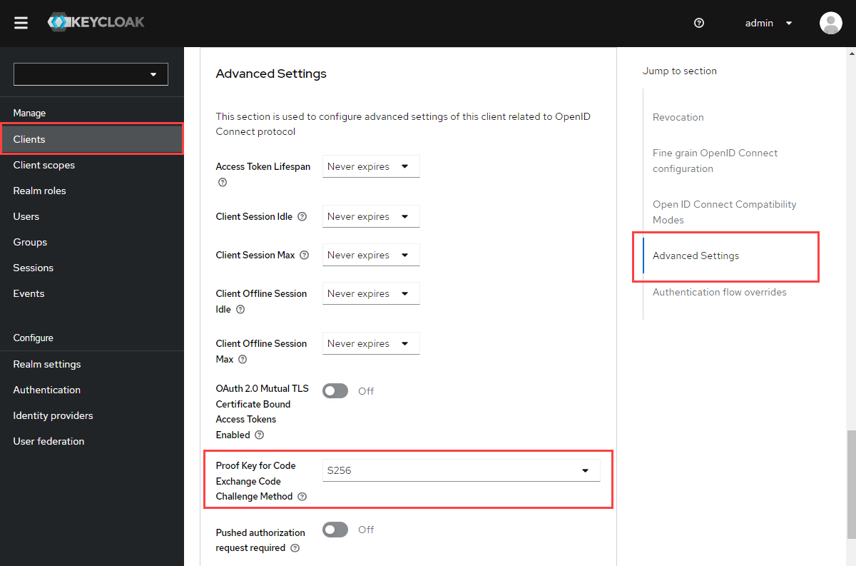 Вкладка Advanced → Advanced Settings → поле Proof Key for Code Exchange Code Challenge Method → указать S256: