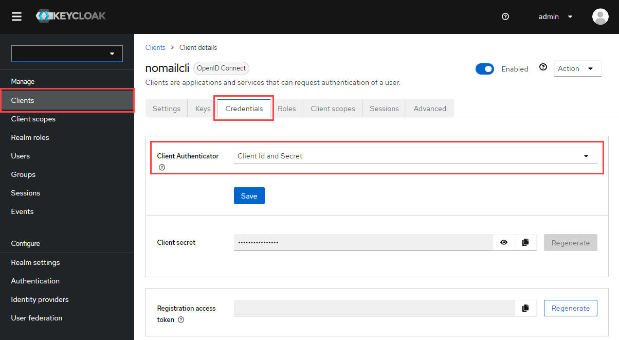 Перейти Manage → Clients → выбрать nomailcli → вкладка Settings → установить значения для полей: