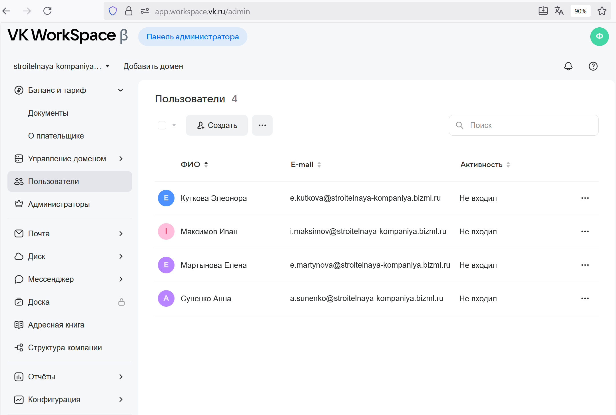 Интерфейс управления всеми сервисами VK WorkSpace называется панелью администратора, он доступен по адресу app.workspace.vk.ru/admin: