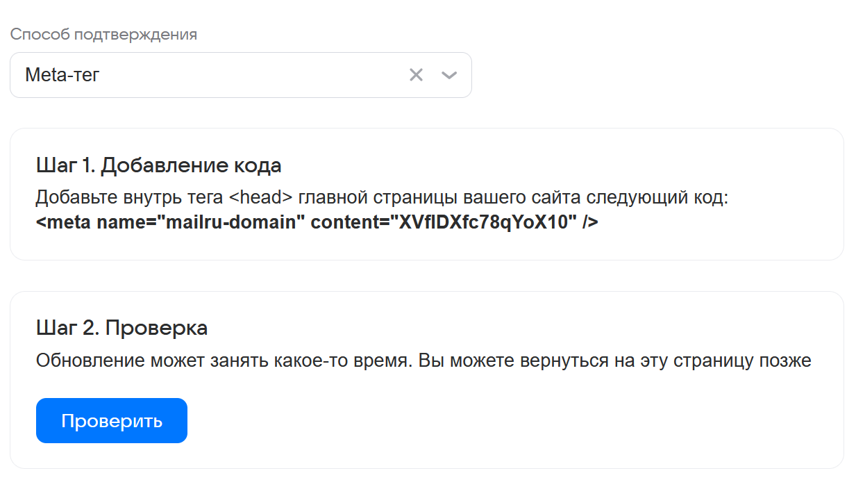 На странице подтверждения домена выберите Мета-тег в качестве способа подтверждения.