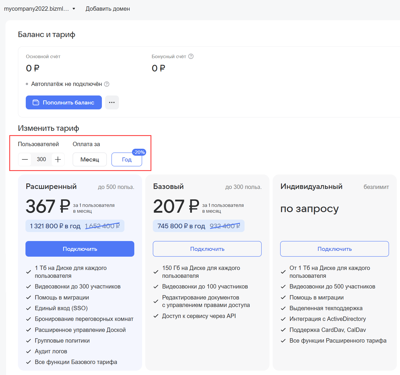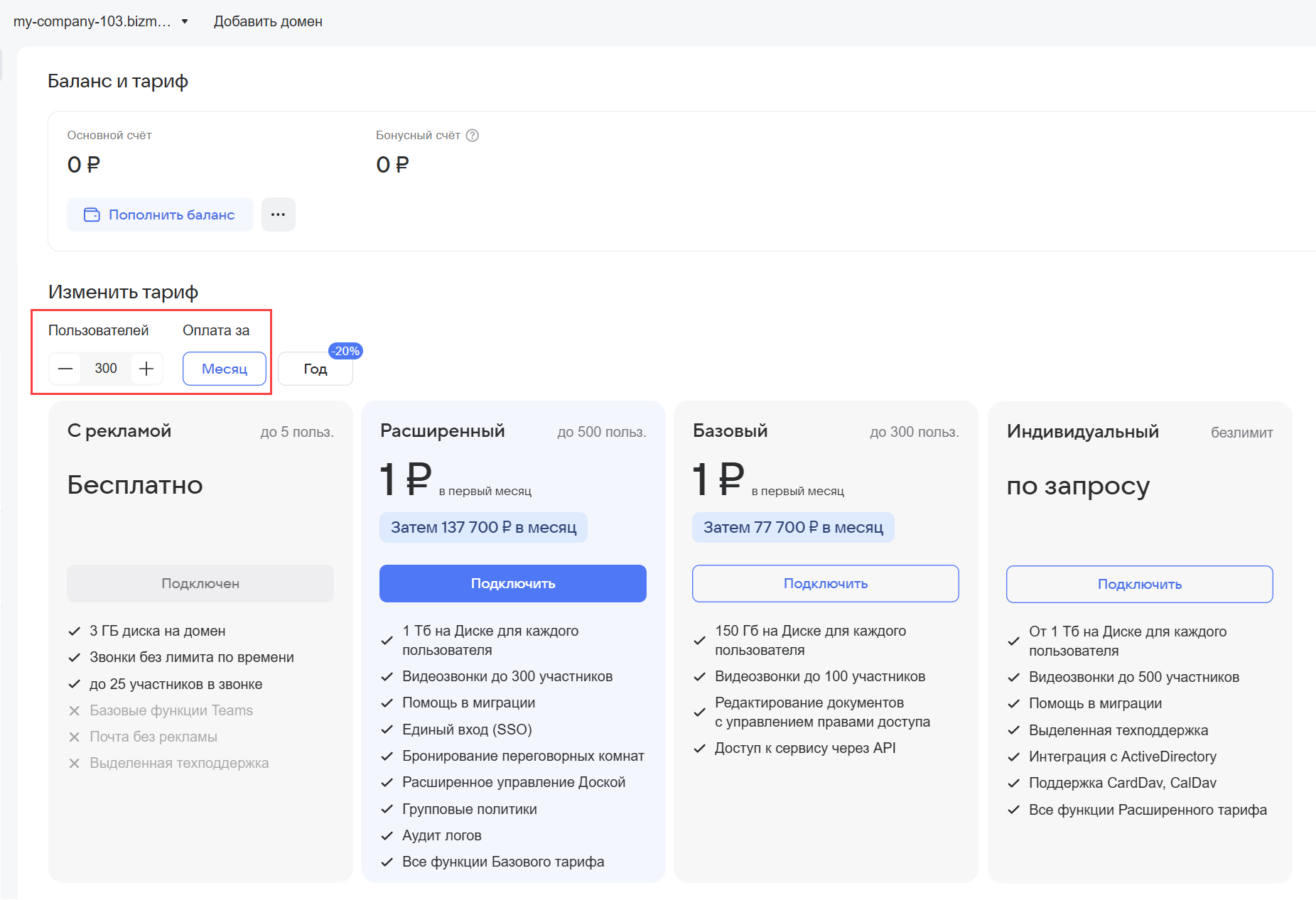 По умолчанию, сразу после создания личного кабинета, действует бесплатный тариф, на котором можно создать только 5 пользователей и ограничена функциональность сервисов. Подключите платный тариф, чтобы иметь все преимущества без ограничений. При этом вы можете воспользоваться пробным периодом всего за 1 рубль.