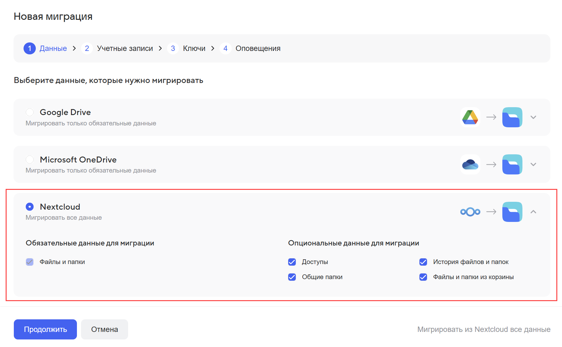 Выберите Nextcloud, укажите, какие данные мигрировать, и нажмите Продолжить.