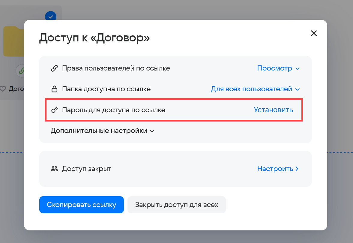 В блоке Пароль для доступа по ссылке нажмите Установить.