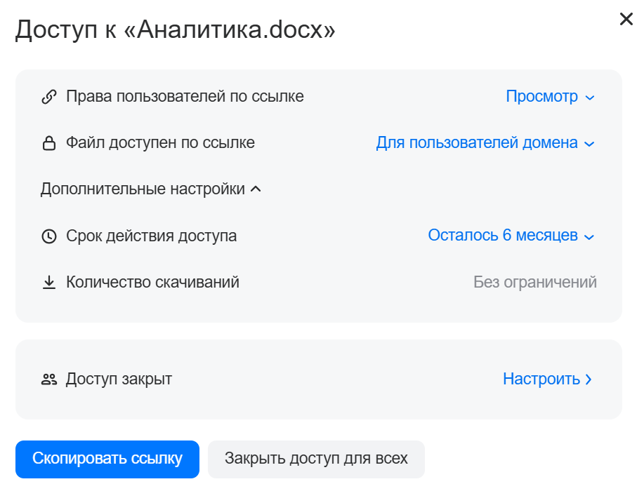 Чтобы поделиться файлом, нажмите Скопировать ссылку и отправьте ссылку адресату. Рекомендуем проверить и выполнить настройки доступа к файлу, прежде чем делиться им: